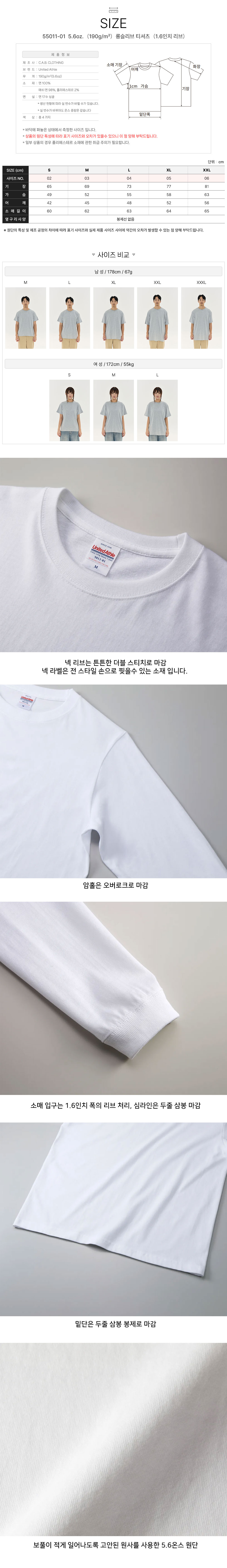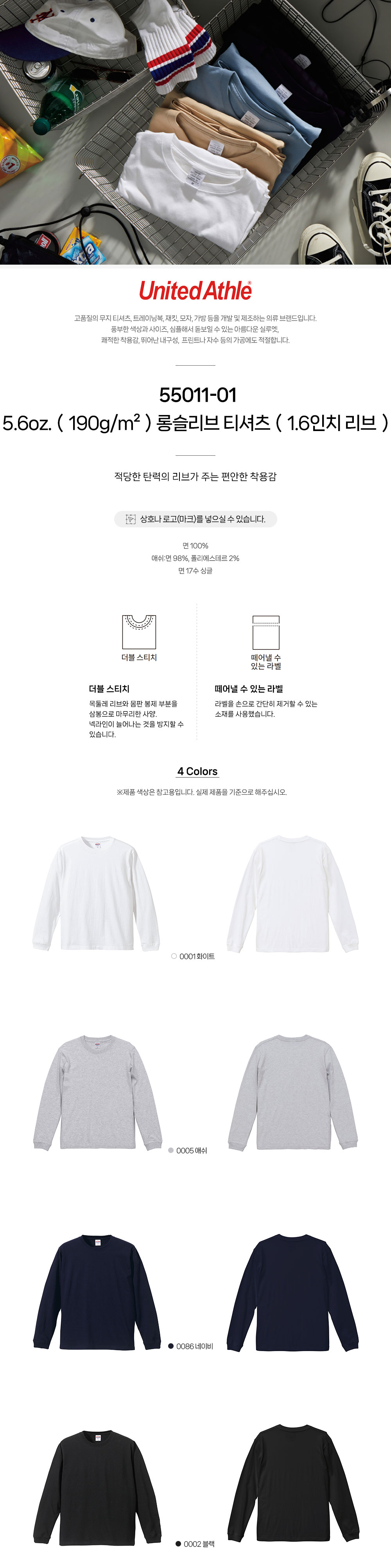 롱슬리브 티셔츠(1.6인치 리브) 55011-01 5.6oz.(190g/m²) 유나이티드 애슬 United Athle