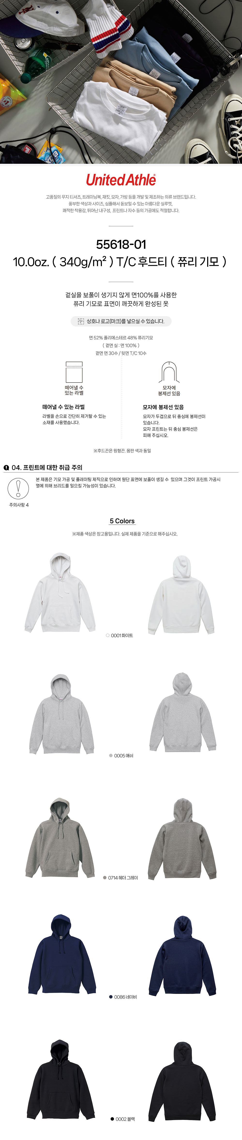 T/C 후드티(쮸리 기모)55618-01 10.0oz.(340g/m²) 유나이티드 애슬 United Athle